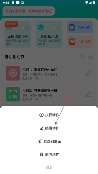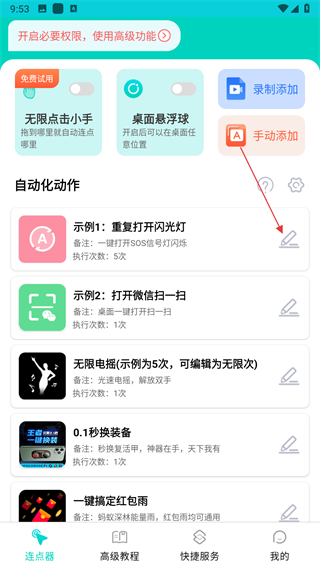 1、打開Tap連點(diǎn)器,在連點(diǎn)器頁面找到自動化動作板塊,點(diǎn)擊示例動作右側(cè)的編輯圖標(biāo)。