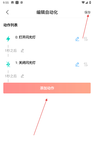 4、向下滑動可查看已有的動作,點(diǎn)擊添加動作能新增步驟,設(shè)置完成后點(diǎn)擊右上角保存。