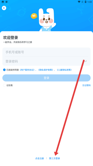 1、在一起作業(yè)app登錄界面,可以通過(guò)點(diǎn)擊底部第三方登錄,進(jìn)入騰訊教育號(hào)第三方登錄頁(yè)面。