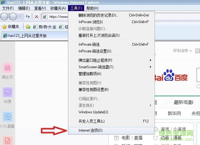 1,打開IE8瀏覽器,打開菜單“工具”下的“Internet 選項(xiàng)”。