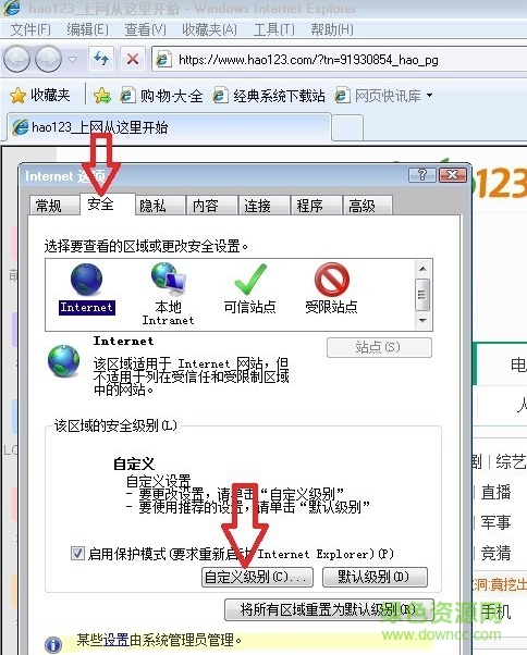 2,進(jìn)入“Internet 選項(xiàng)”窗口后,選擇“安全”這一項(xiàng),然后點(diǎn)擊“自定義級別”按鈕。