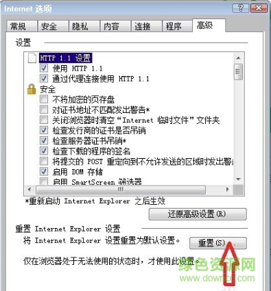 5,如果還不行,再打開“Internet 選項(xiàng)”,這回選擇“高級”這一項(xiàng),然后單擊“重置”按鈕。