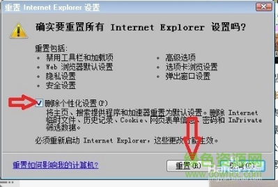 6,進(jìn)入“重置Internet Explorer設(shè)置”窗口,找到“刪除個性化設(shè)置”這項(xiàng),然后將其勾選,按“重置”按鈕,將“Internet 選項(xiàng)”所有項(xiàng)目重置回默認(rèn)狀態(tài)。