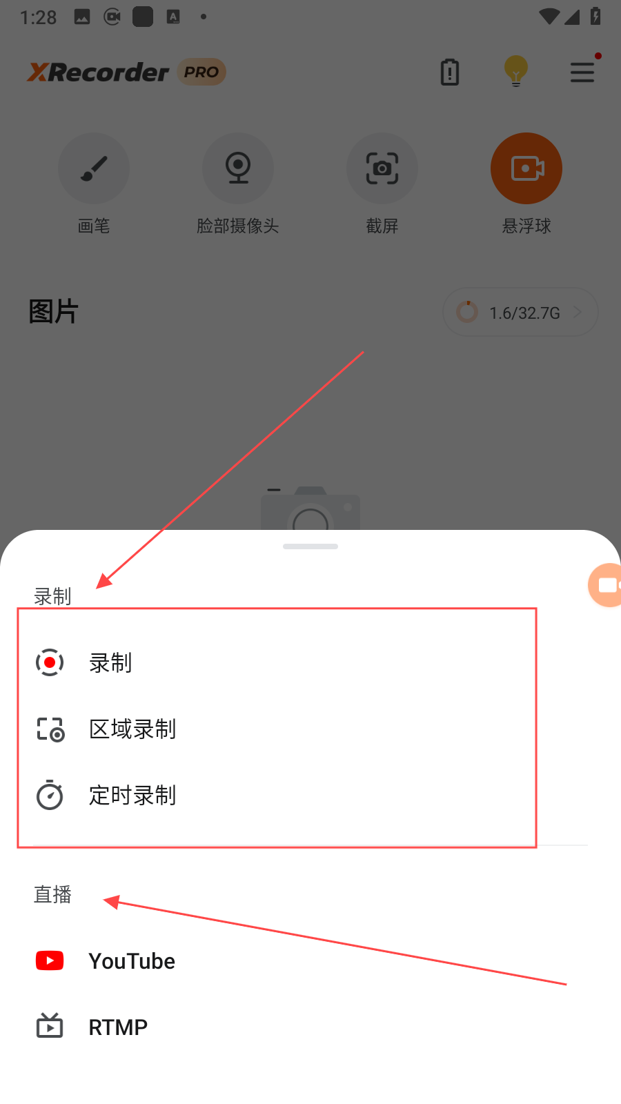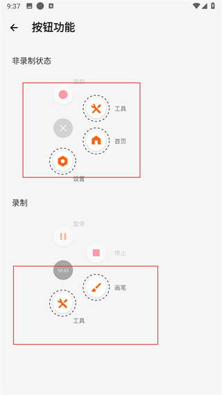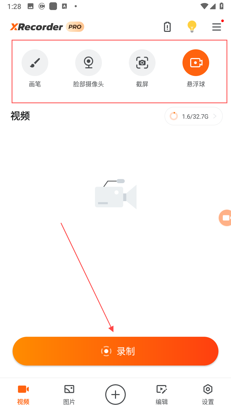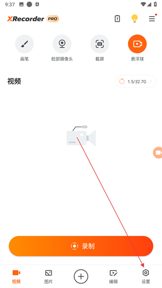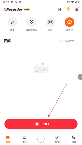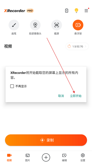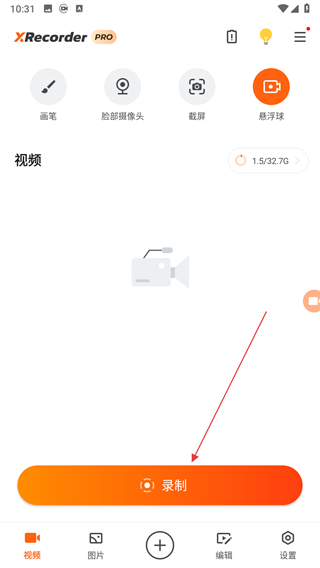 1、打開XRecorder應用,在主界面上方能看到畫筆、臉部攝像頭、截屏、懸浮球等功能選項,點擊下方醒目的橙色錄制按鈕,即可開始常規(guī)屏幕錄制。