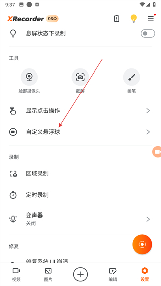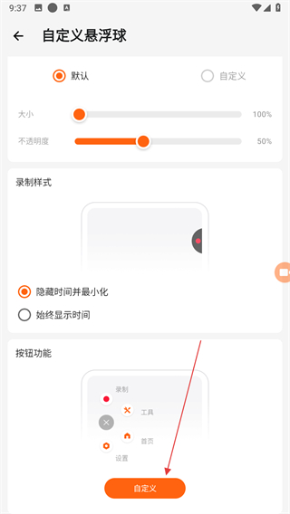3、在自定義懸浮球頁面里,調整礎參數(shù),選擇錄制樣式后點擊自定義。