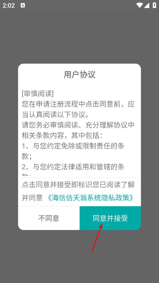 1、打開海信信天翁系統(tǒng),在用戶協(xié)議頁面,點擊“同意并接受”按鈕。