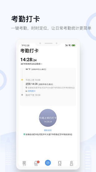 3、考勤打卡:一鍵考勤,時時定位,讓日??记诮y(tǒng)計更簡單;