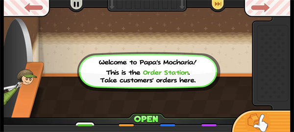 5、進(jìn)入帶店鋪之后,游戲會帶我們熟悉幾個食物、飲品的操作界面,隨后就會開始【迎接顧客】;