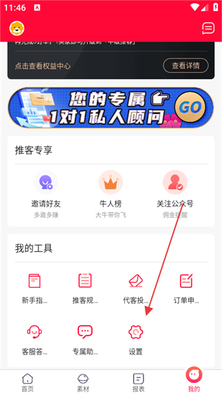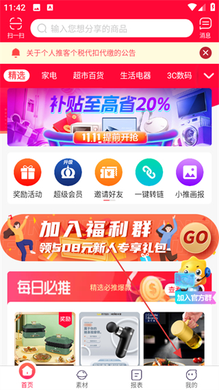 1、打開(kāi)蘇寧推客APP,點(diǎn)擊底部導(dǎo)航欄中的我的選項(xiàng)。