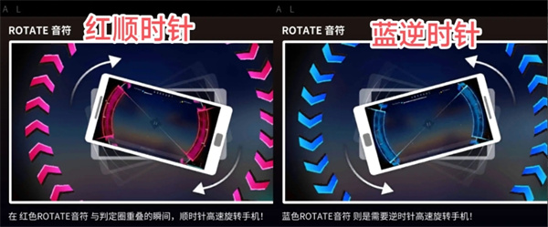 4、紅色音符,無(wú)需點(diǎn)按,需要旋轉(zhuǎn)手機(jī)與判定區(qū)域?qū)R通過(guò)即判定成功 (圖三,進(jìn)階按鈕,高難度一般會(huì)與其他音符同時(shí)出現(xiàn),同時(shí)滿足條件即可)