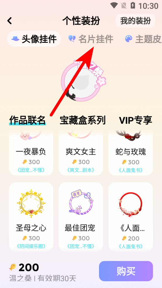 3、在個(gè)性裝扮頁面,點(diǎn)擊名片掛件選項(xiàng),進(jìn)入名片掛件選擇界面。