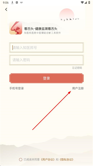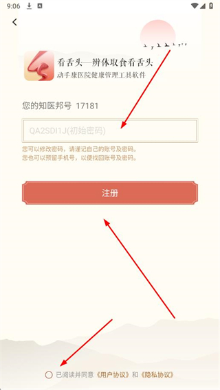 3、勾選用戶協(xié)議,輸入知醫(yī)邦號和初始密碼,點擊注冊。