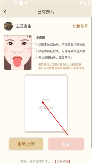 2、在已有照片頁面點擊添加照片區(qū)域,進(jìn)入手機(jī)相冊選擇對應(yīng)的舌頭照片。