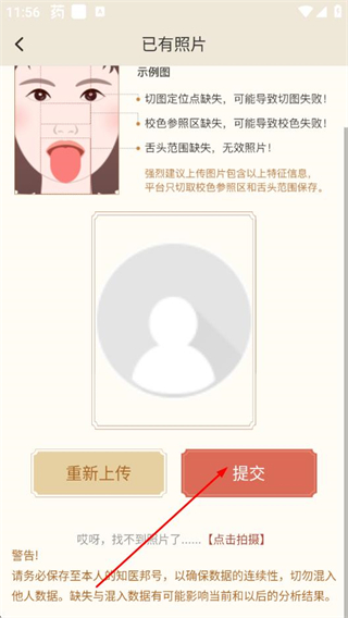 4、照片上傳完成后,點擊頁面中的提交,等待App分析舌象信息。
