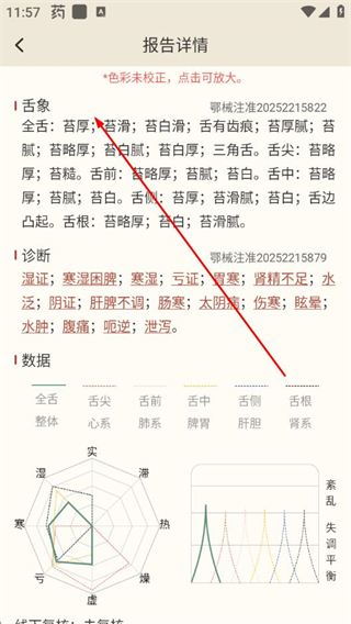 5、分析完成后,即可在報告詳情頁面查看舌象描述、診斷結(jié)果及數(shù)據(jù)圖表等信息。