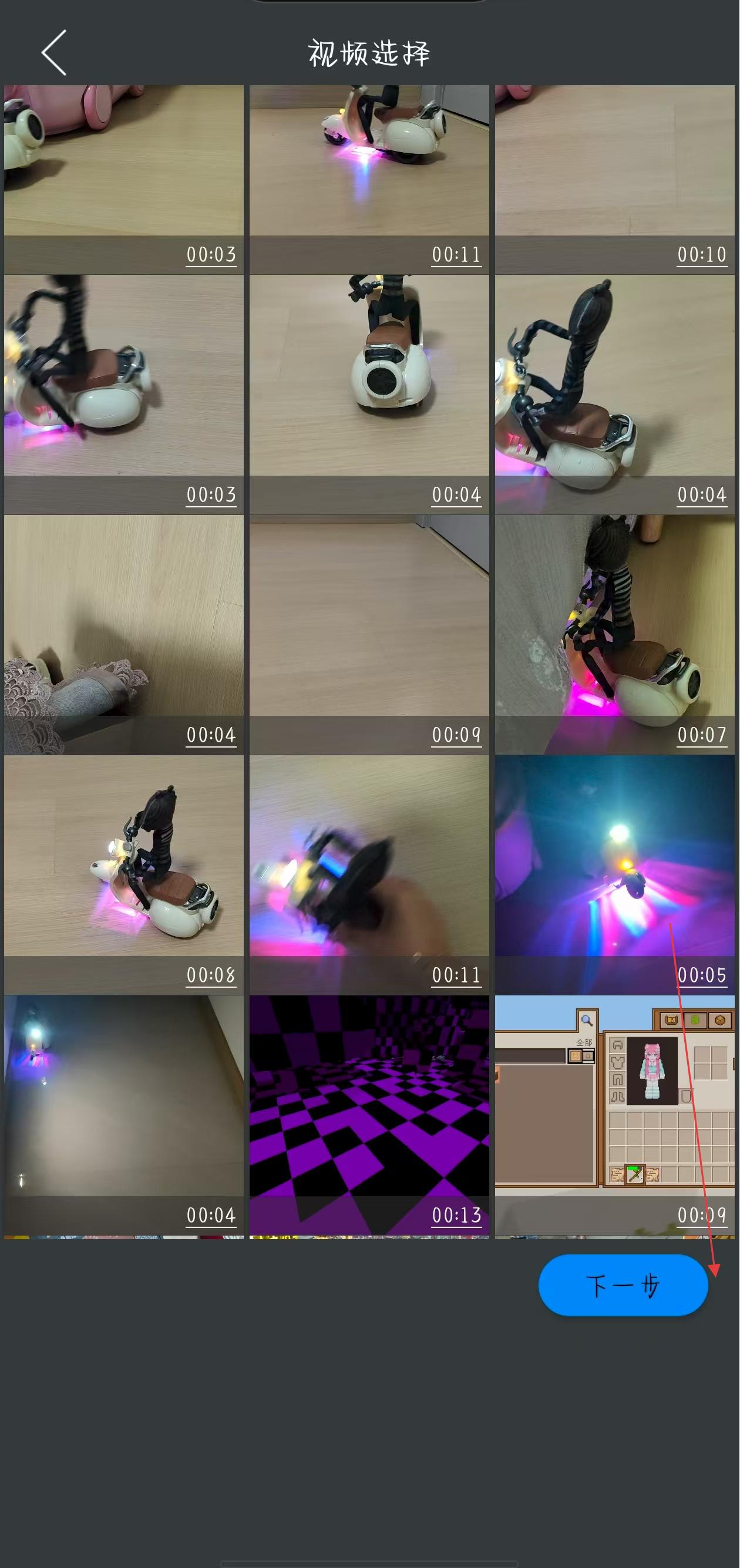 2、在視頻選擇界面,挑選需要剪輯的視頻素材,選中后點(diǎn)擊下一步。