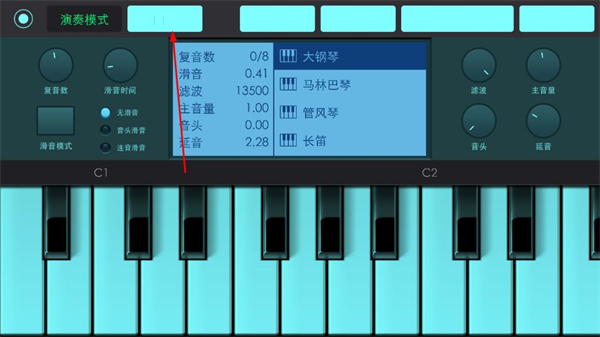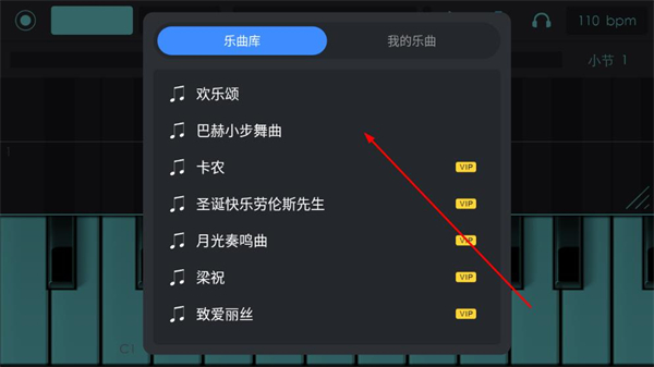 1、打開(kāi)電子琴樂(lè)隊(duì)APP,切換到樂(lè)曲模式,進(jìn)入樂(lè)曲選擇界面。