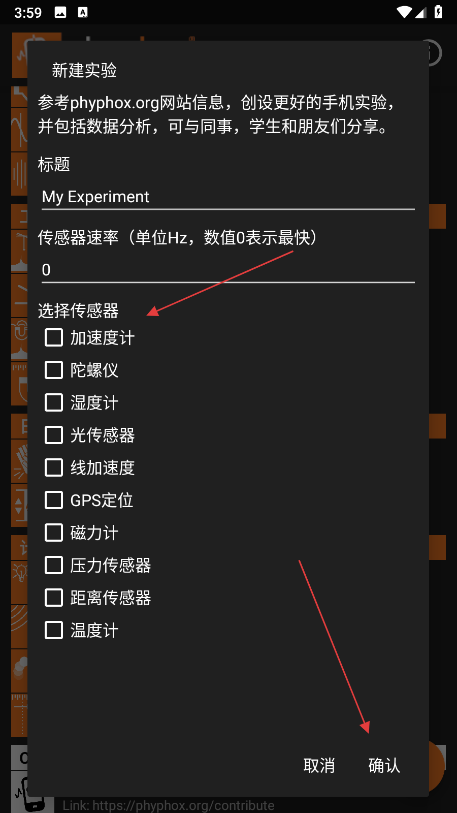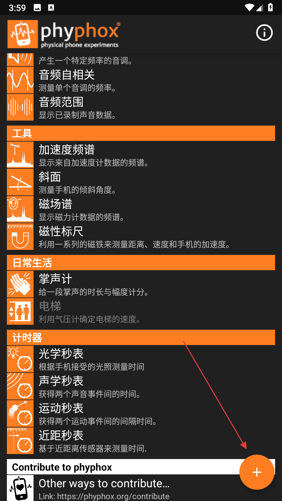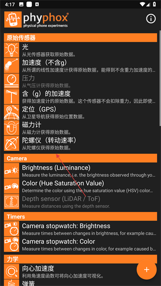 1、打開phyphox應(yīng)用,選擇想要進(jìn)行的實(shí)驗(yàn)項(xiàng)目。