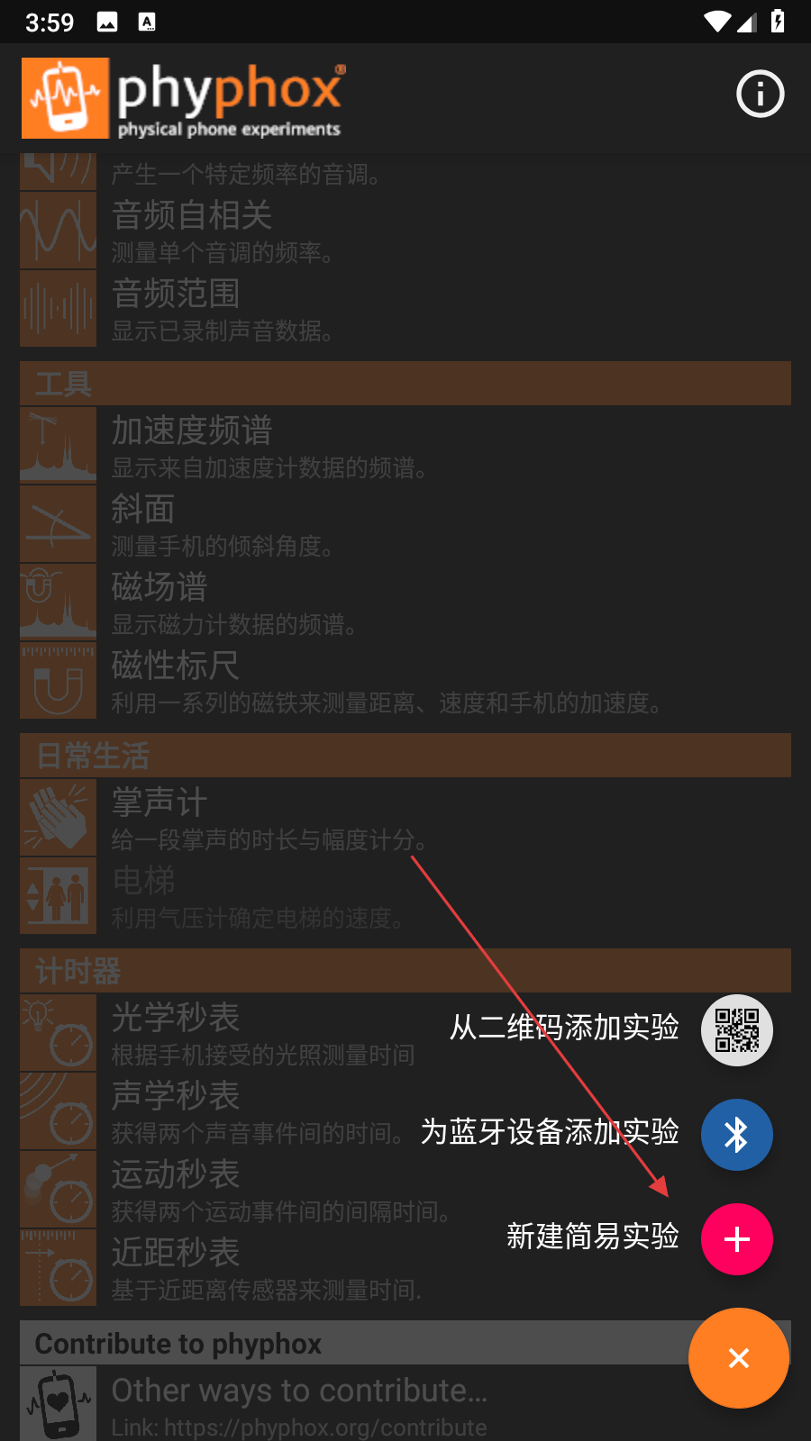 1、打開手機(jī)物理工坊應(yīng)用,在主界面點(diǎn)擊右下角橙色+按鈕,彈出選項(xiàng)列表,點(diǎn)擊新建簡(jiǎn)易實(shí)驗(yàn),進(jìn)入新建實(shí)驗(yàn)界面。