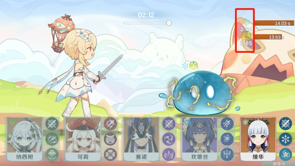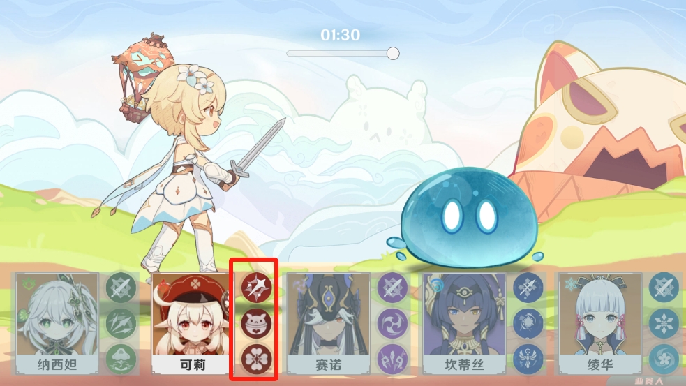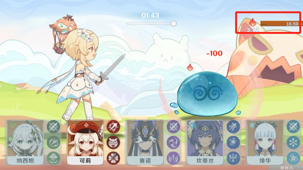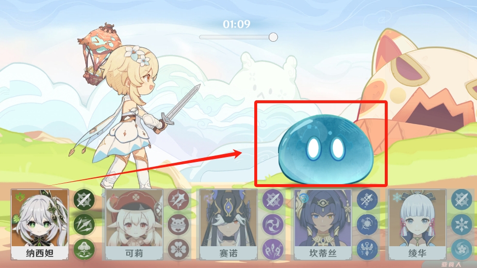 1、進(jìn)入軟件后可以看到有多個不同元素技能的角色可以選擇使用,利用不同的攻擊去攻擊這個水元素的史萊姆;