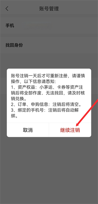 4、在注銷的提示框中,點擊繼續(xù)注銷按鈕,完成賬號注銷操作。