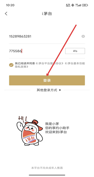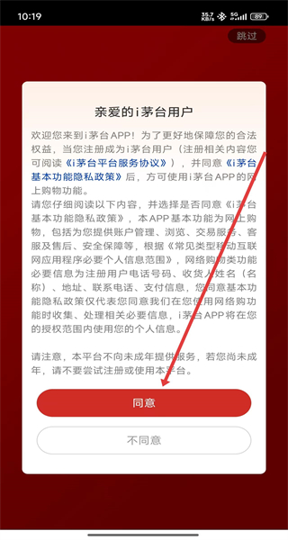 1、點擊“隱私政策更新”彈窗的“同意”,進(jìn)入i茅臺APP登錄界面。