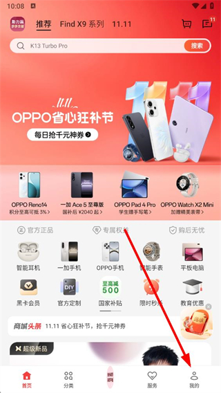 1、打開(kāi)oppo商城app,點(diǎn)擊底部導(dǎo)航欄中的我的選項(xiàng)。