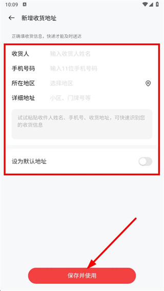 5、在新增收貨地址頁(yè)面輸入收貨人、手機(jī)號(hào)等信息,點(diǎn)擊保存并使用即可完成添加。