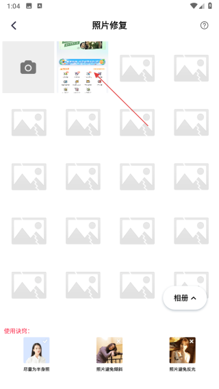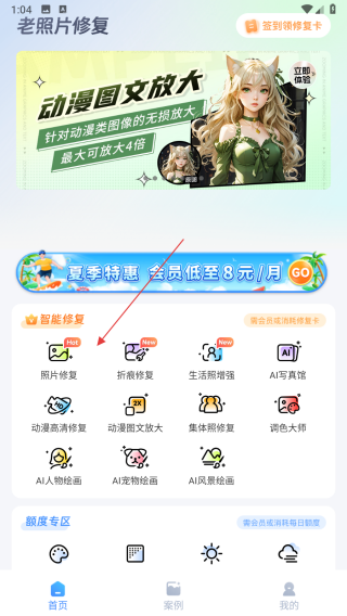 1、打開老照片修復(fù)應(yīng)用,在智能修復(fù)板塊中點(diǎn)擊照片修復(fù)選項(xiàng),進(jìn)入照片修復(fù)功能界面。