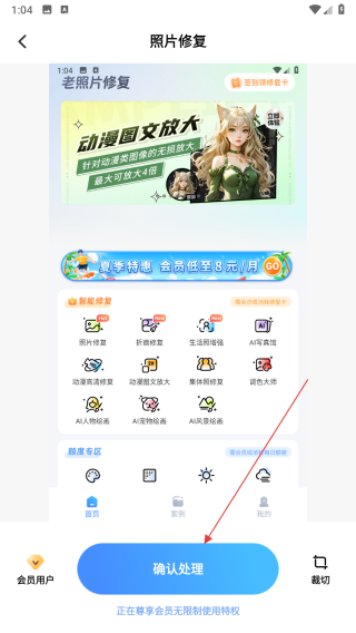 4、選好照片后,點(diǎn)擊頁面底部的確認(rèn)處理按鈕,等待應(yīng)用對(duì)照片進(jìn)行智能修復(fù)處理。