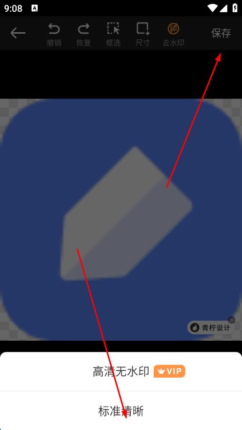 4、完成圖片的各項(xiàng)編輯操作,點(diǎn)擊右上角保存按鈕,選擇合適的清晰度即可。