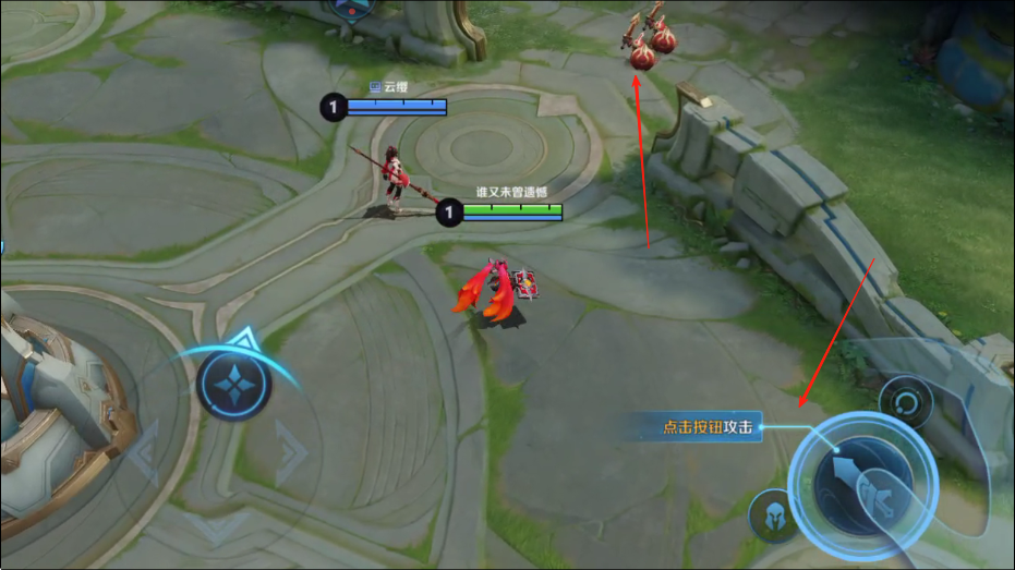 1、進(jìn)入游戲?qū)?zhàn),操控英雄移動(dòng)到兵線處,看到右側(cè)點(diǎn)擊按鈕攻擊提示,點(diǎn)擊攻擊按鈕,可對(duì)敵方小兵發(fā)起攻擊,獲取經(jīng)驗(yàn)和金幣。