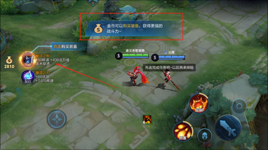 3、積攢足夠金幣后,看到左側(cè)點(diǎn)擊購(gòu)買裝備提示,點(diǎn)擊進(jìn)入裝備購(gòu)買界面,選擇適合英雄的裝備,購(gòu)買后能提升英雄戰(zhàn)斗力,助力后續(xù)戰(zhàn)斗與發(fā)育。