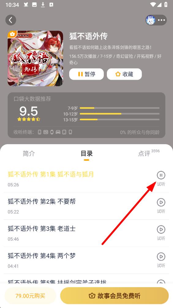 2、在故事詳情頁面中,找到目錄板塊,選擇想要試聽或收藏的具體集數(shù),點擊該集數(shù)右側的試聽按鈕開始播放故事。