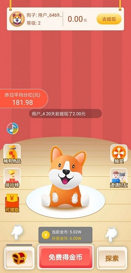 2、用戶可以一鍵領取新人專屬紅包,領養(yǎng)可愛的小狗狗,提升賬戶等級可獲得的收益就越高;