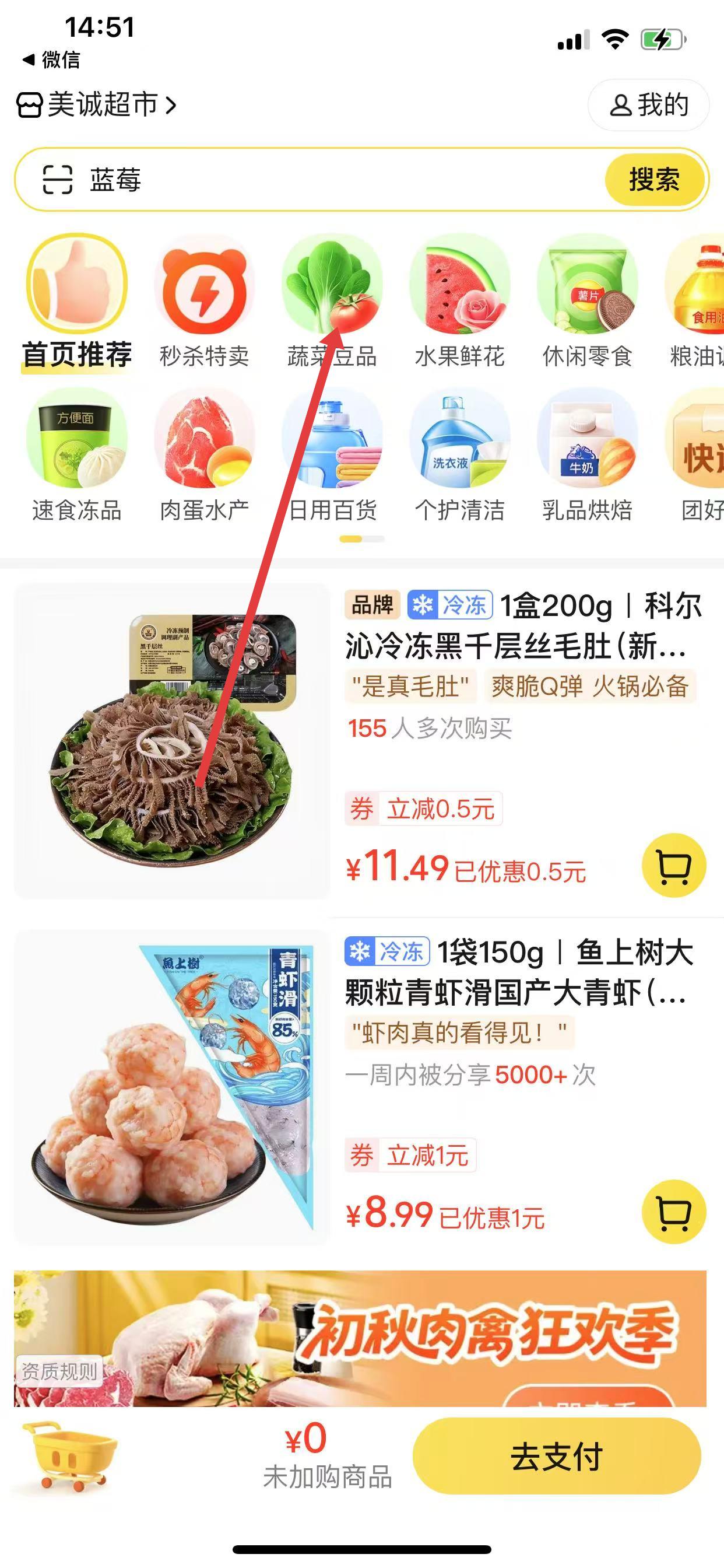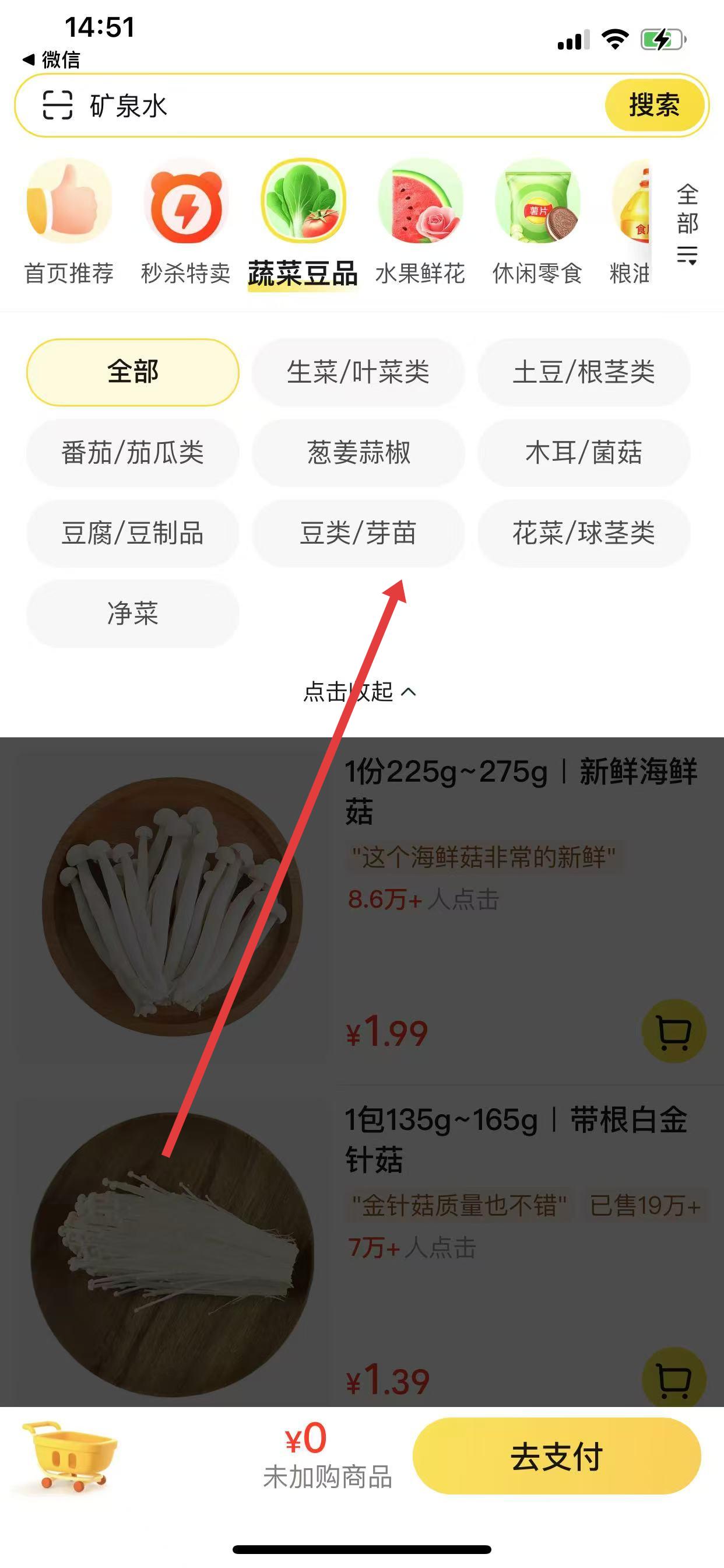 1、打開美團(tuán)優(yōu)選,在首頁(yè)點(diǎn)擊蔬菜豆品的分類。