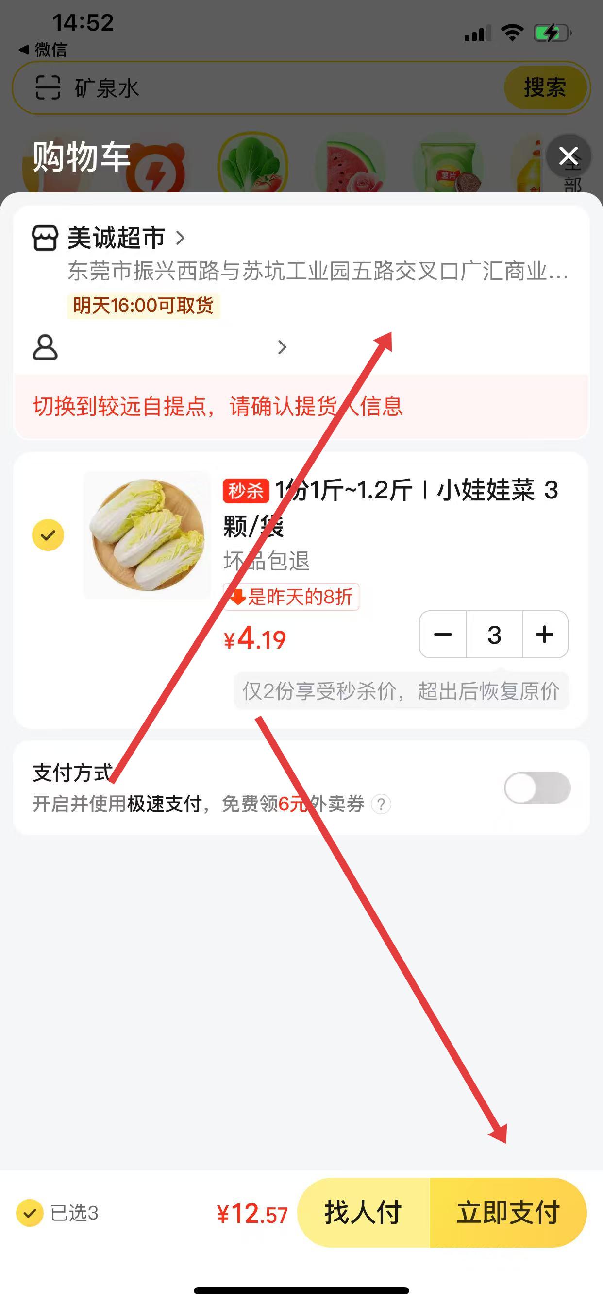 4、在購(gòu)物車頁(yè)面確認(rèn)自提點(diǎn)及商品信息,選擇找人付或立即支付完成下單。