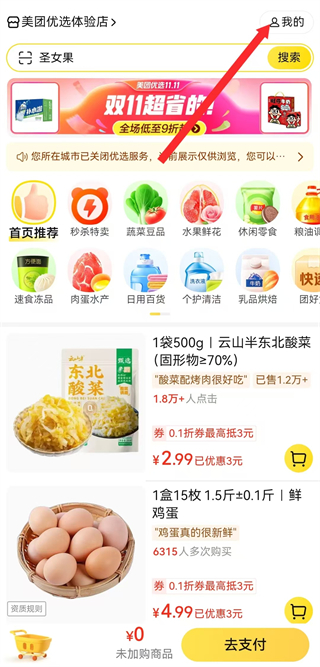 1、打開美團(tuán)優(yōu)選APP,點(diǎn)擊右上角我的,進(jìn)入個(gè)人的頁(yè)面。