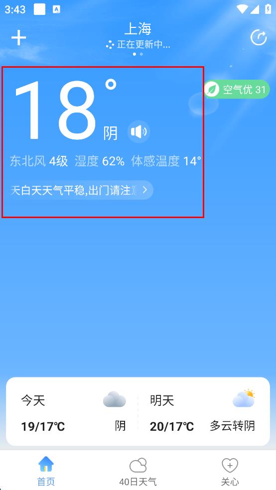 實(shí)時(shí)天氣狀況:生動(dòng)形象的動(dòng)態(tài)背景,清晰展示當(dāng)前溫度、濕度、體感溫度和風(fēng)向,更有智能詳細(xì)的語(yǔ)音播報(bào)