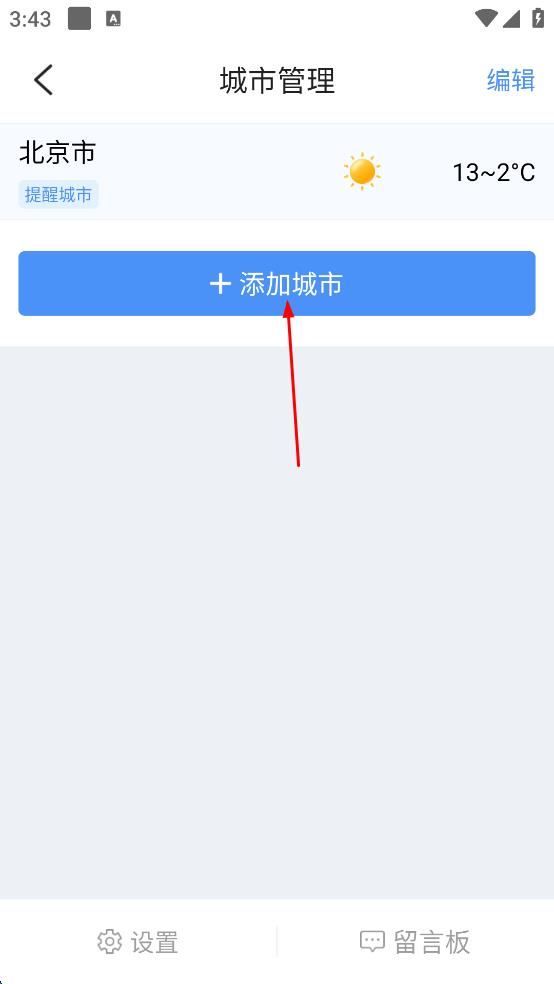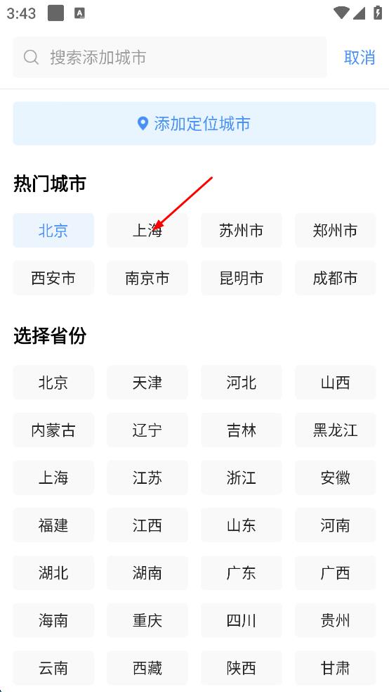 2、在城市管理頁(yè)面,點(diǎn)擊“+添加城市”按鈕,進(jìn)入城市選擇頁(yè)面。