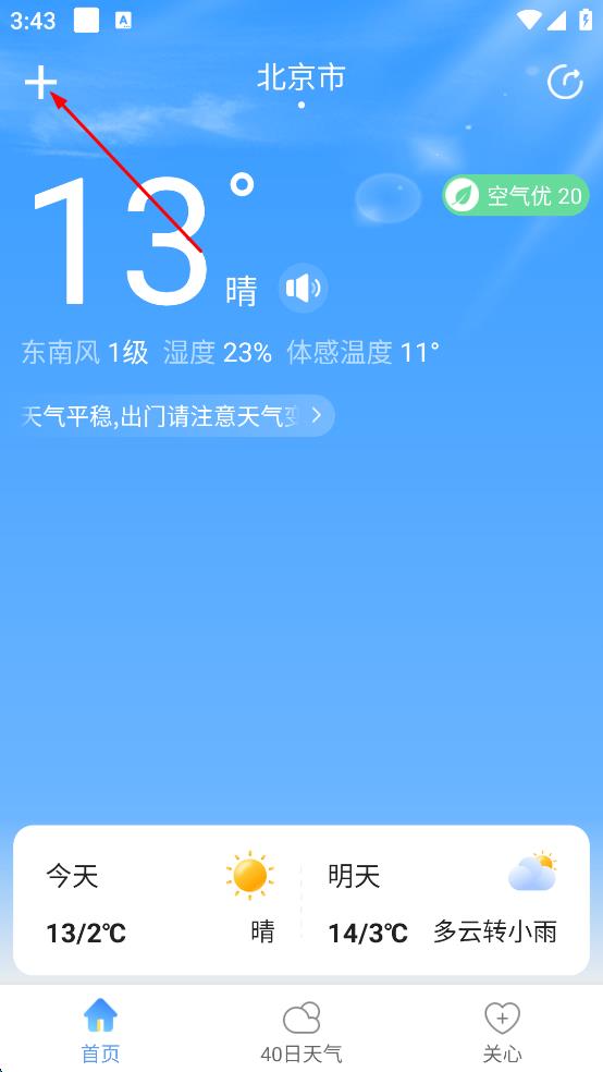1、打開軟件,點(diǎn)擊左上角“+”選項(xiàng),進(jìn)入城市管理頁(yè)面。