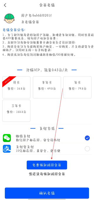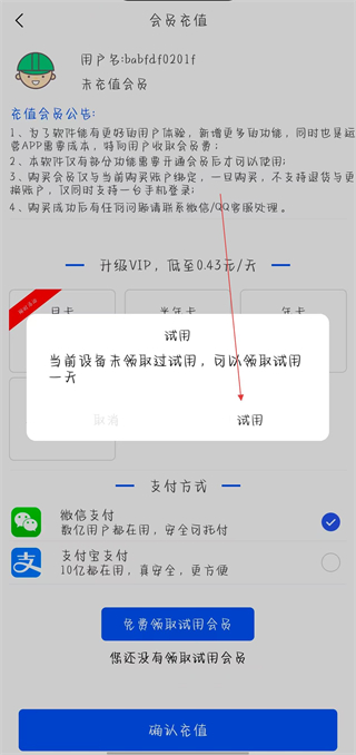 3、在會(huì)員充值界面,點(diǎn)擊免費(fèi)領(lǐng)取試用會(huì)員按鈕,觸發(fā)試用領(lǐng)取的彈窗。