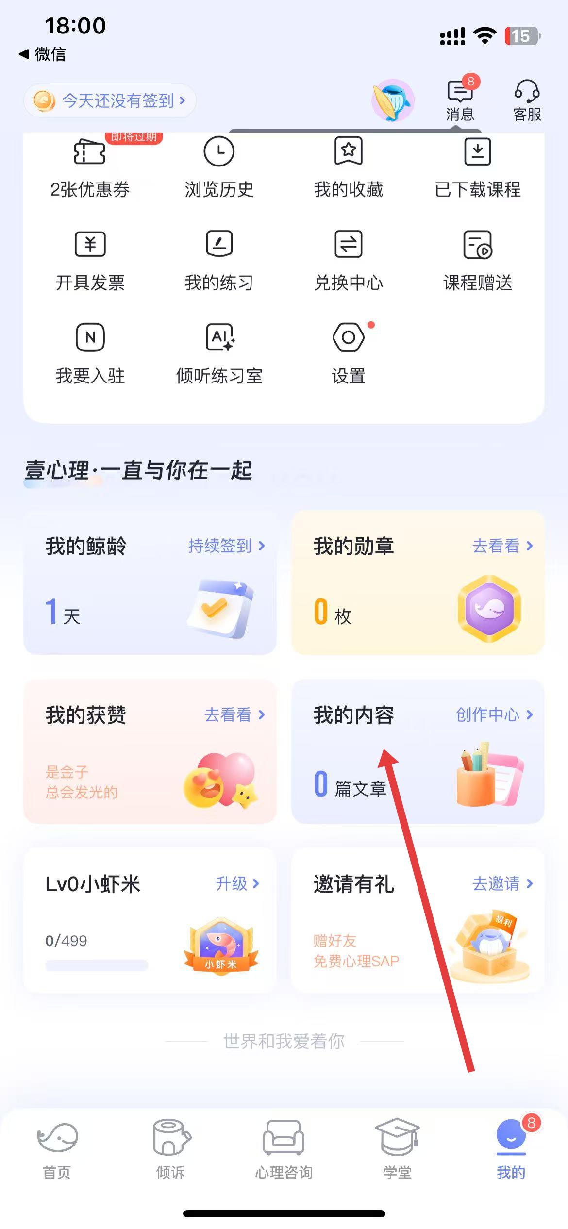 2、在個人信息頁面中下滑找到我的內(nèi)容并點擊。