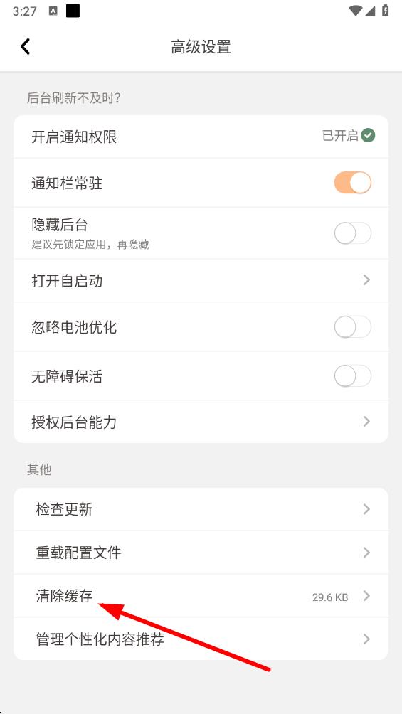 3、進(jìn)入高級(jí)設(shè)置頁(yè)面后,下滑找到清除緩存選項(xiàng)并點(diǎn)擊。