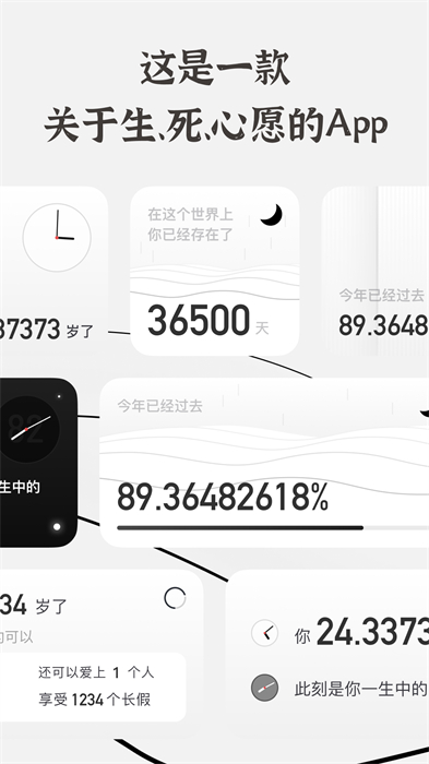 生辰app安卓版可以用來記錄下每天的生活點(diǎn)滴,更是將生命的珍貴展露無遺,當(dāng)你輸入出生日期,軟件會(huì)精確算出你在這世間已度過的年、月、周、天、小時(shí)與分鐘數(shù),而預(yù)估的死亡年齡,也會(huì)讓你看到剩余時(shí)光里還能吃多少頓飯、經(jīng)歷多少個(gè)周末等,這串?dāng)?shù)字促使你正視生命的有限,更積極地?fù)肀睢?