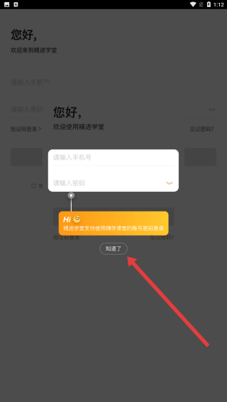 1、登錄界面彈出提示彈窗,點(diǎn)擊知道了關(guān)閉提示,繼續(xù)賬號登錄相關(guān)操作。