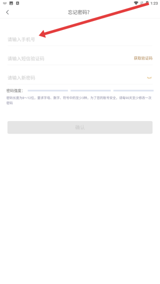3、忘記密碼頁面,在請輸入手機(jī)號輸入框填寫號碼,推進(jìn)密碼重置步驟。
