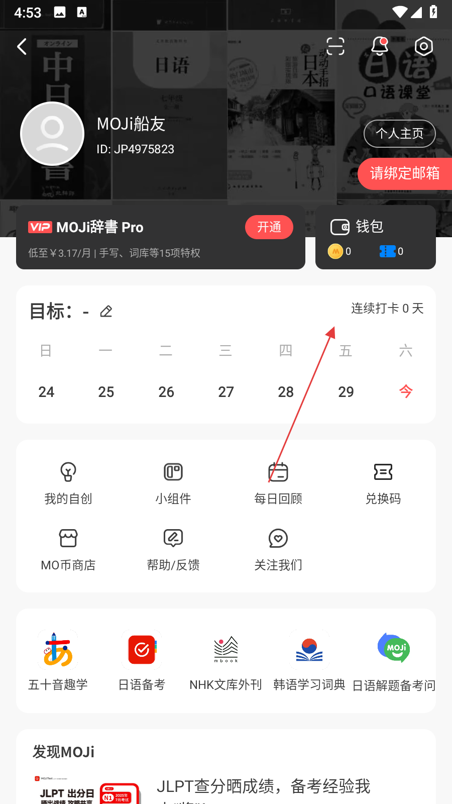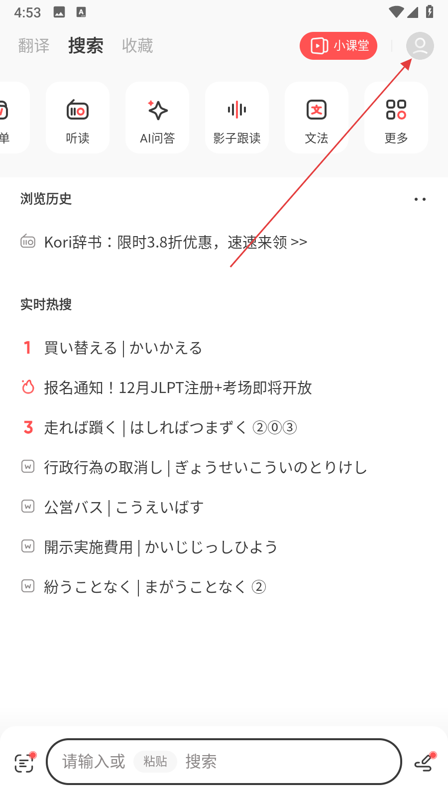 1、打開moji辭書應用,點擊頁面右上角的頭像圖標,進入個人中心頁面。