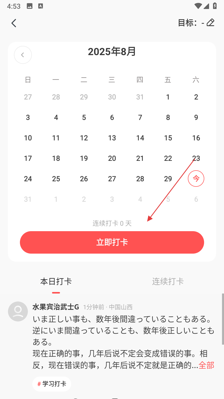 3、在打卡日歷界面中,點擊紅色立即打卡按鈕,完成當日打卡操作。