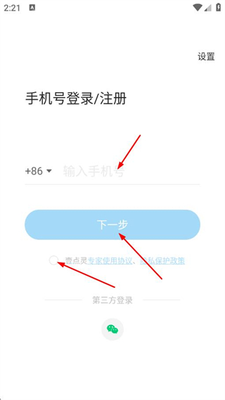 1、打開壹點靈心理咨詢師APP,輸入手機號,勾選協(xié)議,點擊下一步。